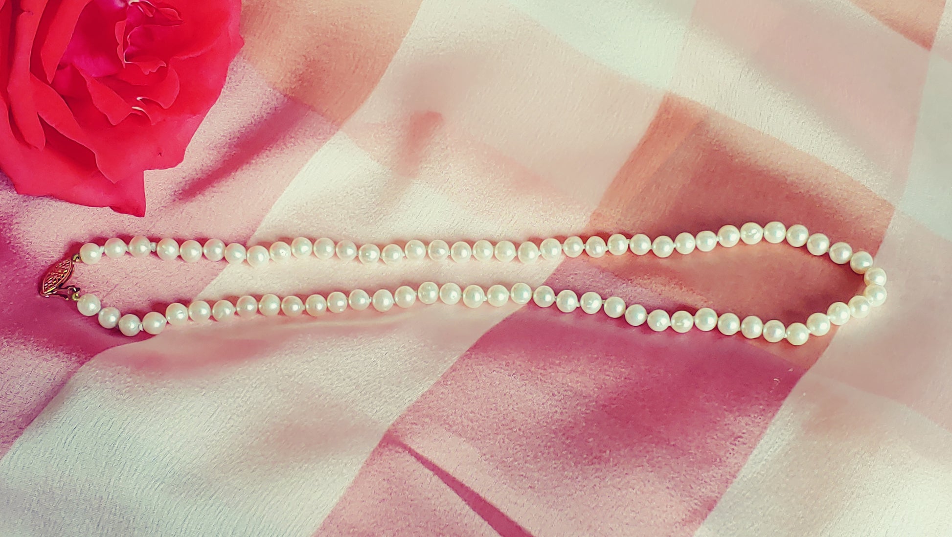 5mm, white, freshwater pearls are hand knotted on silk, then finished off with a gold filled, filigree, fish hook, clasp.