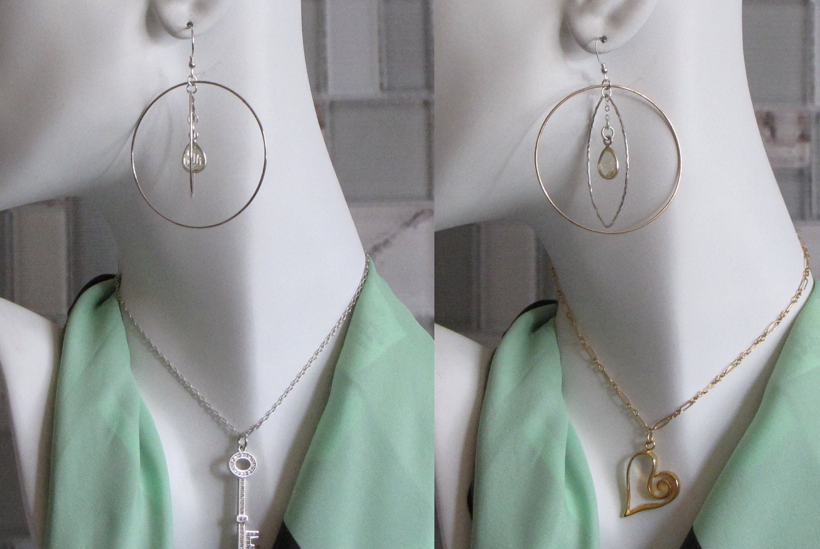 The other pair of earrings are made of smooth gold filled circle hoops, then hammered sterling silver oval hoops. And then again, bezel green quartz, or green amethyst pendant.