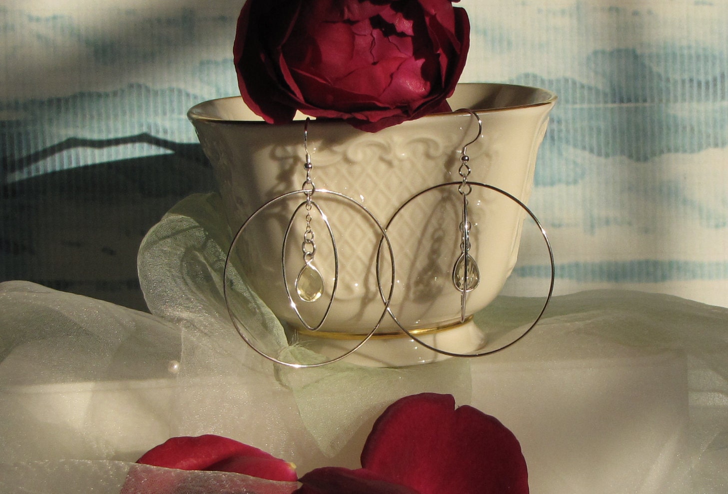 A fusion of art and fashion, circle and oval hoop earrings measure a total of 2 1/1 inches from ear wire, to bottom. The moving parts make for a delightful, animated affect. So when you're seeing one hoop from a certain angle, the other hoop is visible from another. Fun and enchanting, one pair features a smooth sterling silver, circle hoop with oval hoops, also smooth, and finished off with a bezel green quartz, or green amethyst pendant