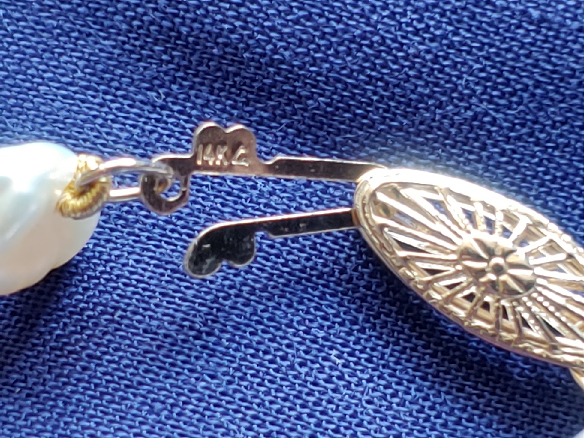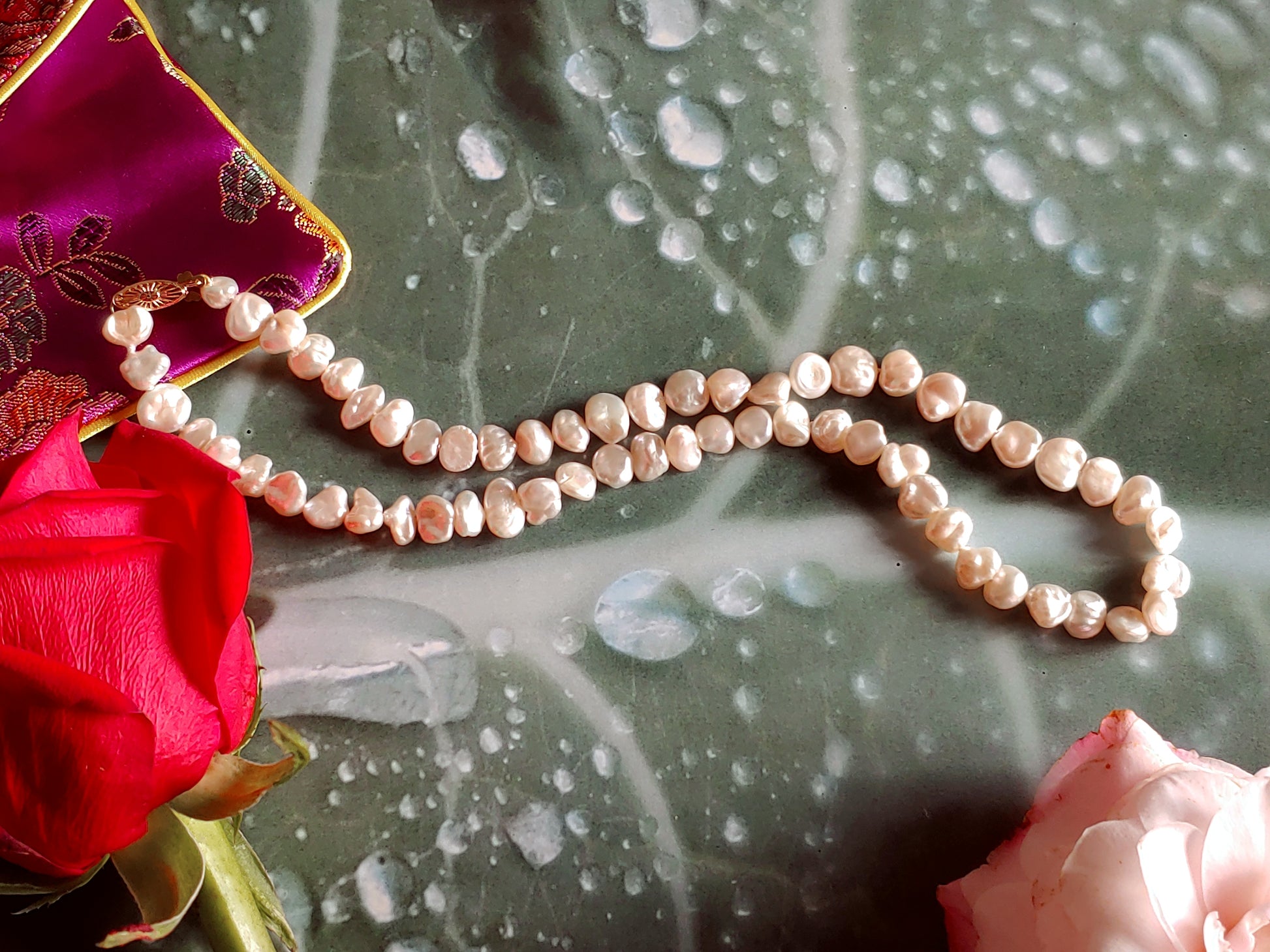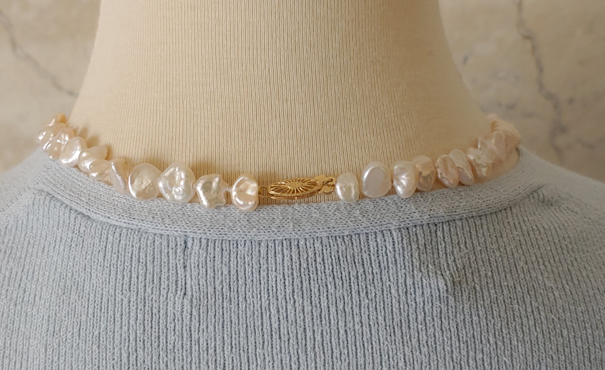 Lustrous, 8 millimeter, biwa pearls have been individually, hand knotted on silk thread. Then finished off with a 14 karat, yellow gold, filigree, clasp.