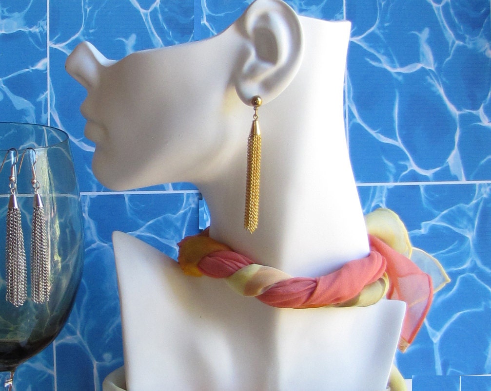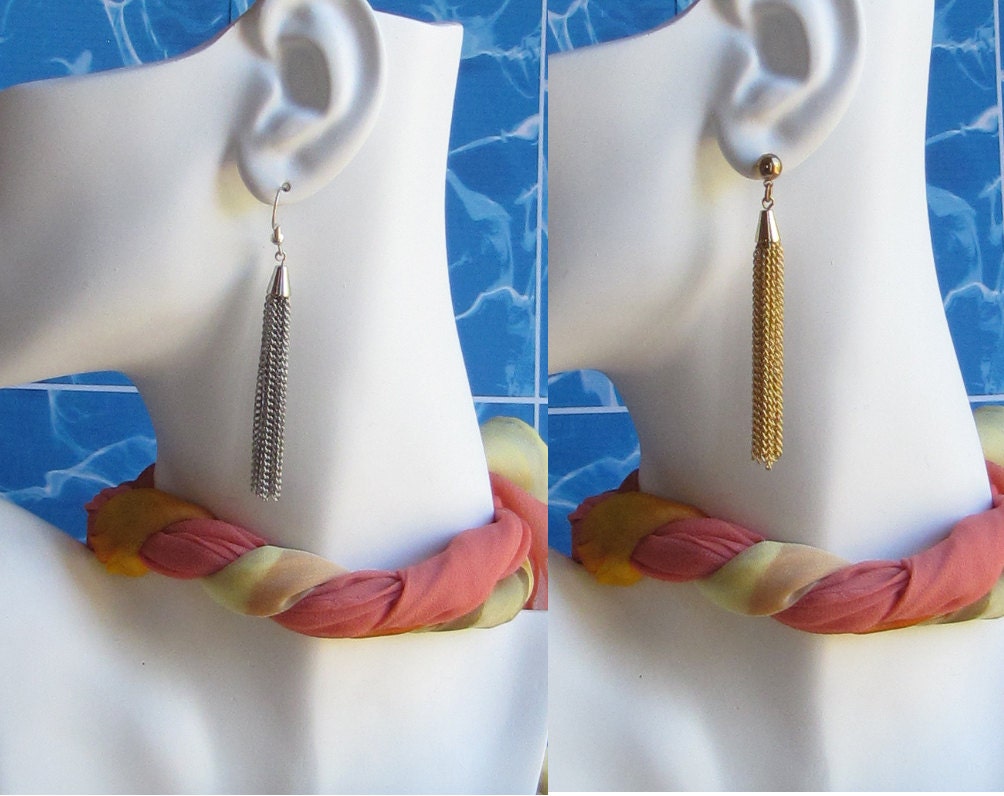 Tassel earrings in silver colored or gold plated chain, hang about 2 and a half inches with gold plated, or silver plate posts, ear wire, or clip on for non pierced ears. Simply choose which type you prefer under the "finding type" option.