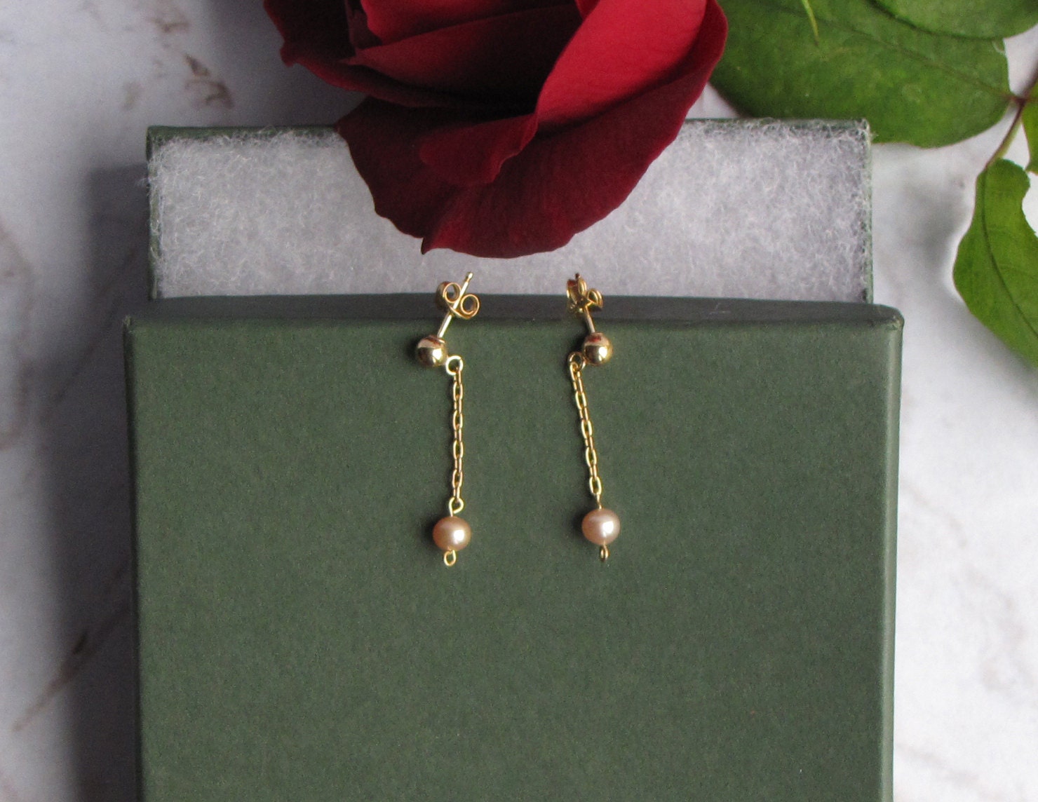 The pearl earrings measure just under one inch in length, and are handmade, with gold filled posts, and gold fill chain. The pearls themselves are about half of one centimeter (or 0.5 cm) around.