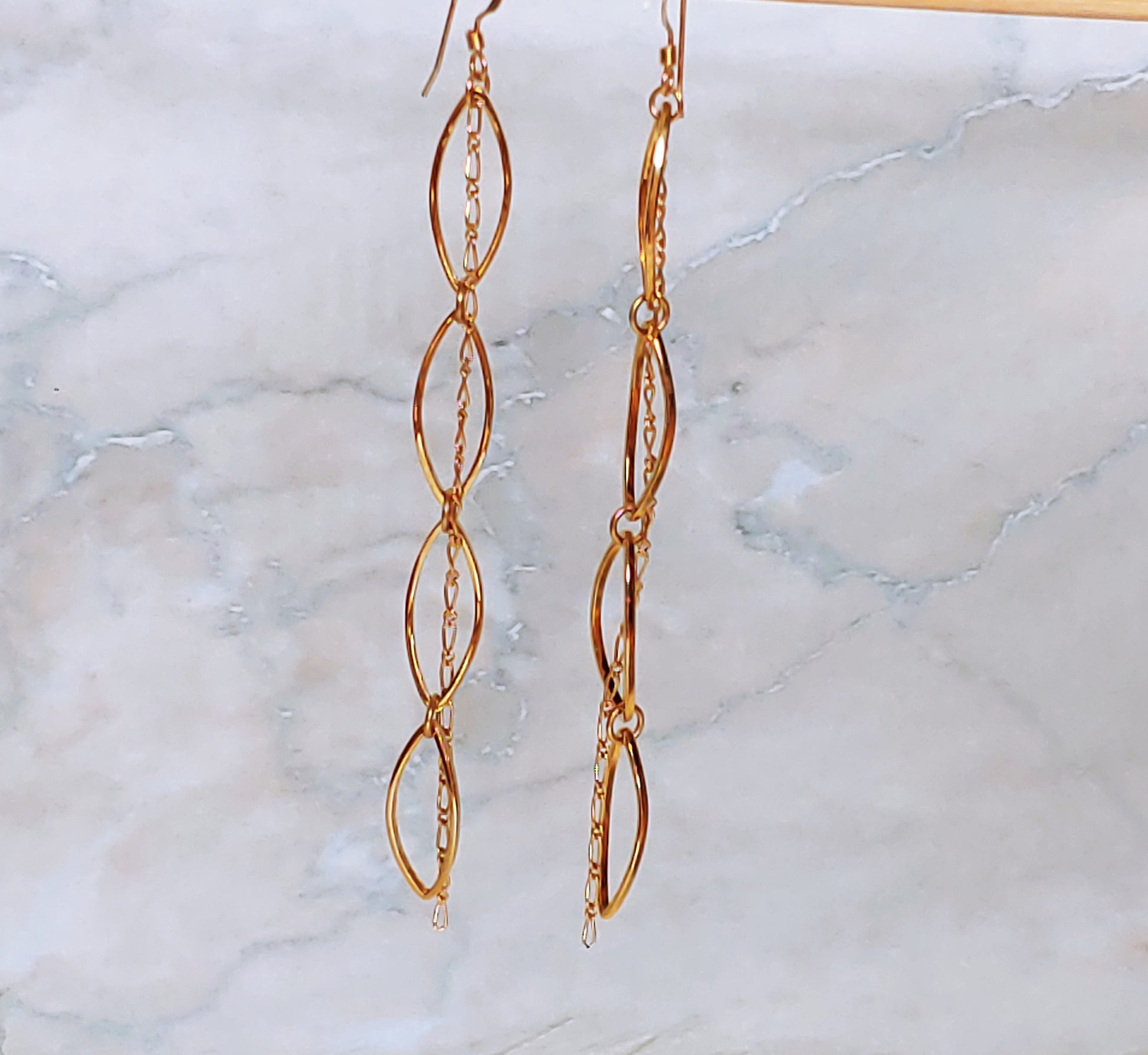 Both versions have 14k gold filled ear wire that have the 4 link version measure just over 3 and three quarter inches long and the 3 link version measuring just under 3 inches. The links are all about half a centimeter in width.