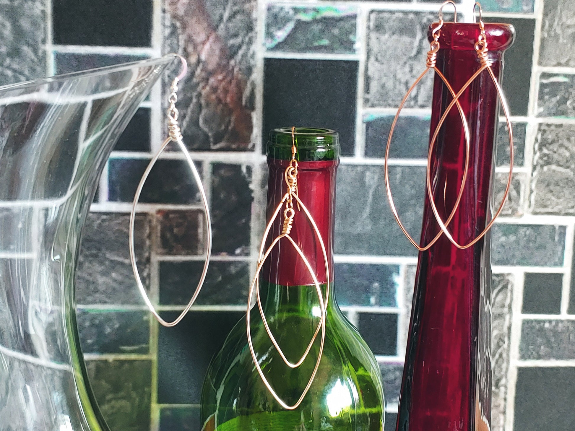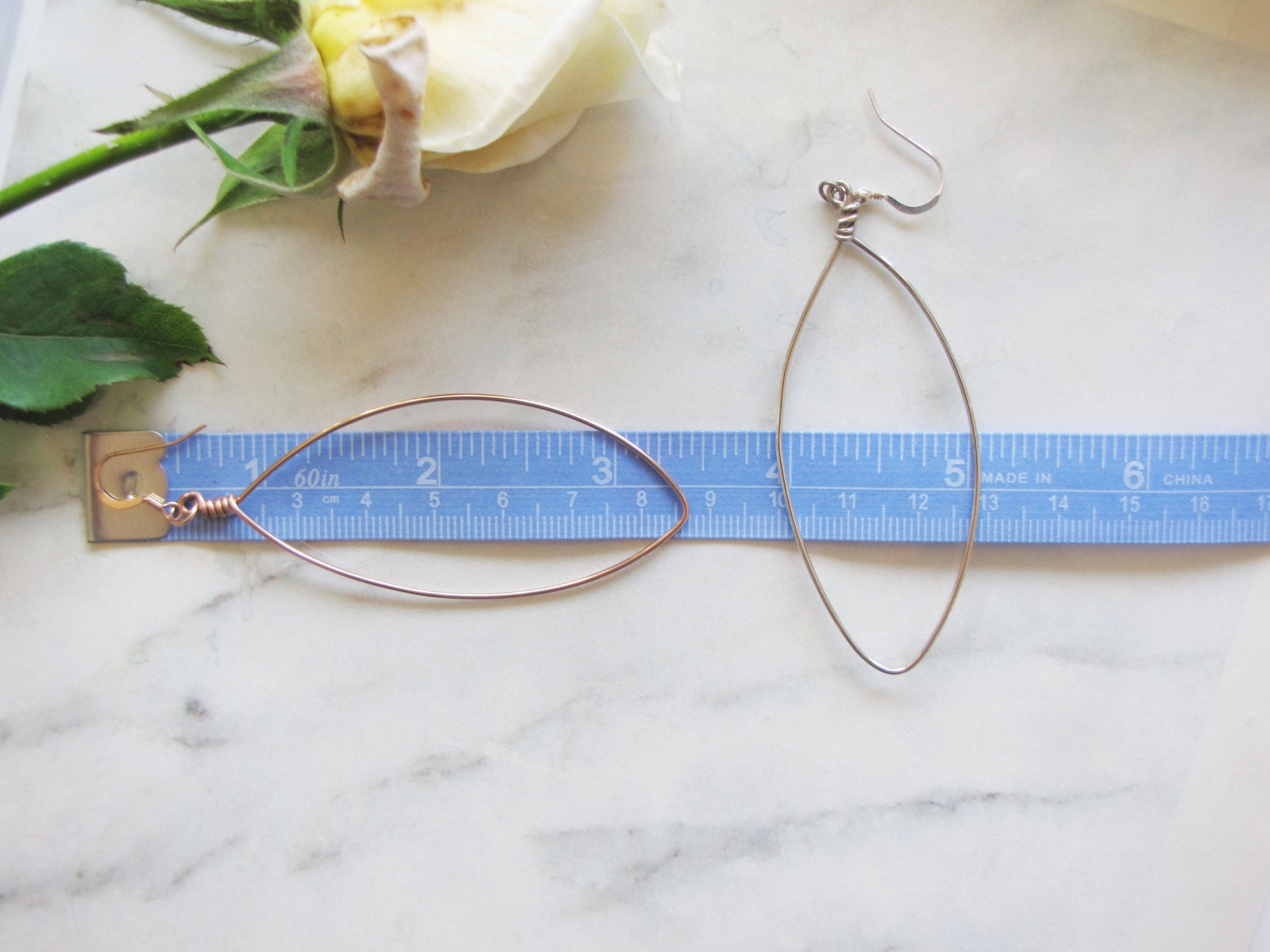 Wire wrapped by hand, Marquise shaped, hoop earrings are made of either sterling silver, gold filled, or rose gold filled wire. Since they're hand molded, then wrapped wire so they don't slip!