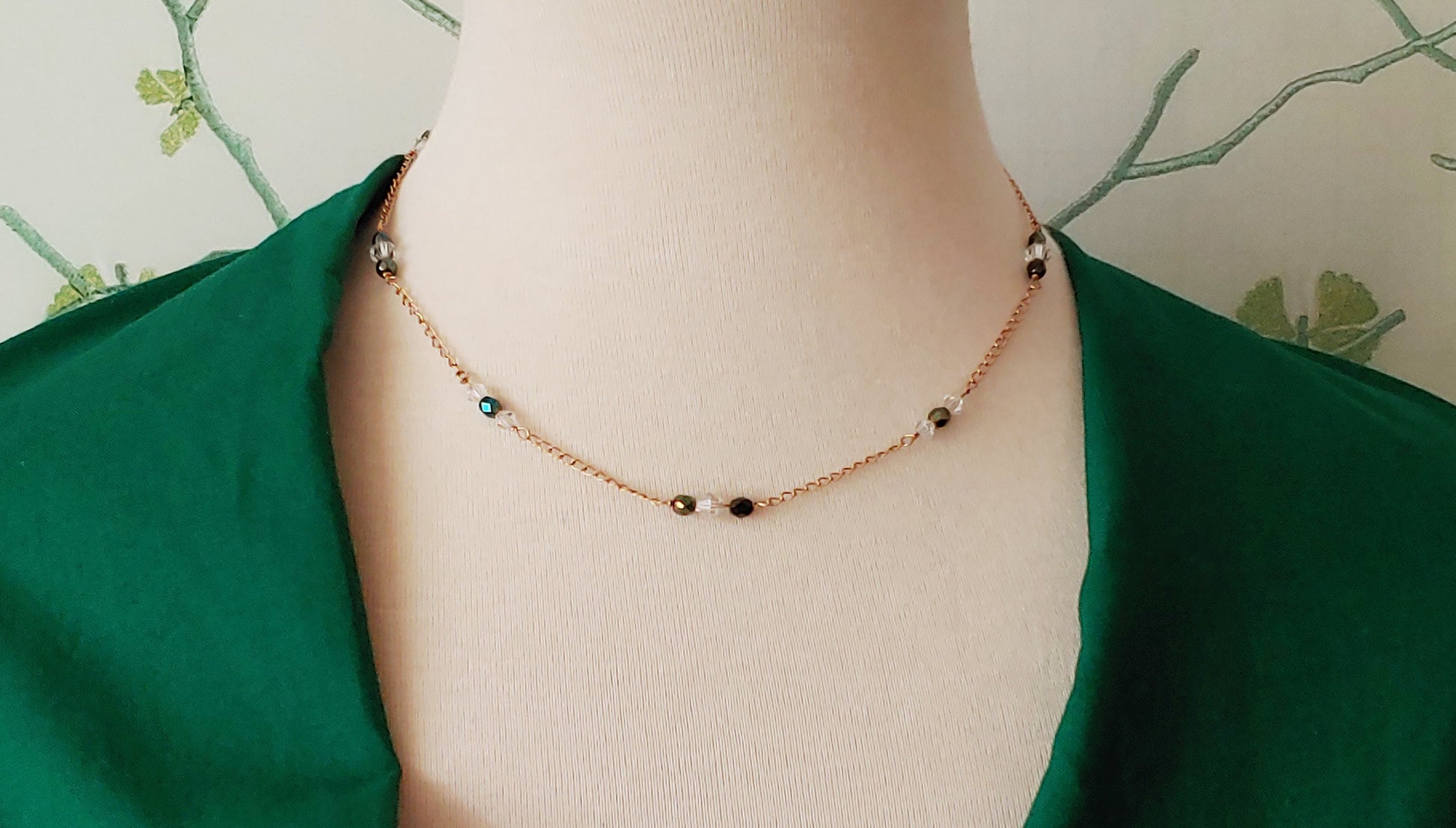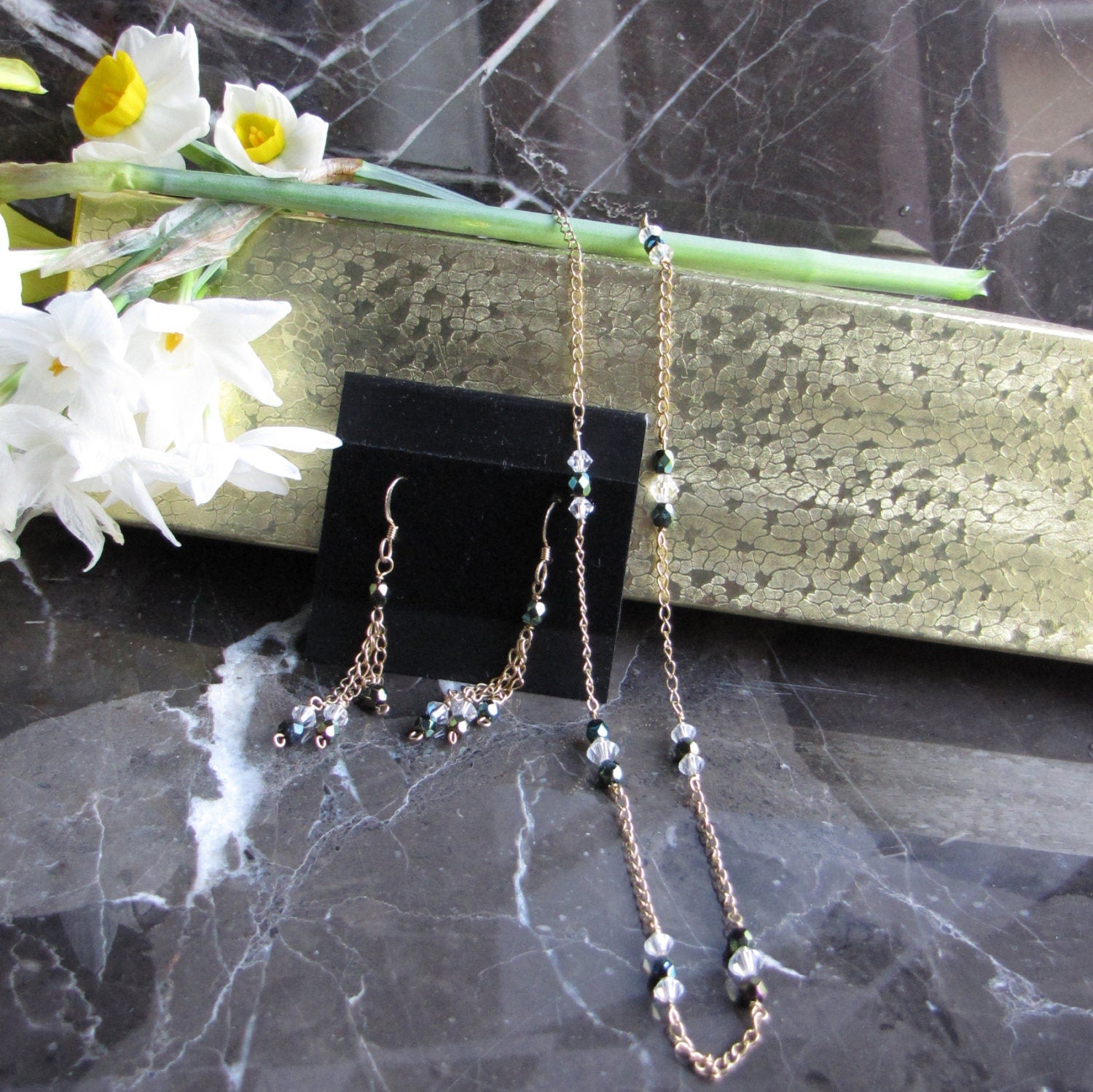 Clear and iridescent green Swarovski crystal, wire wrapped on 16 inch gold fill chain with matching earrings. The earrings, are made of matching gold filled chain, and hung on gold filled ear wire. The beautiful drop earrings measure about two and a half inches long.