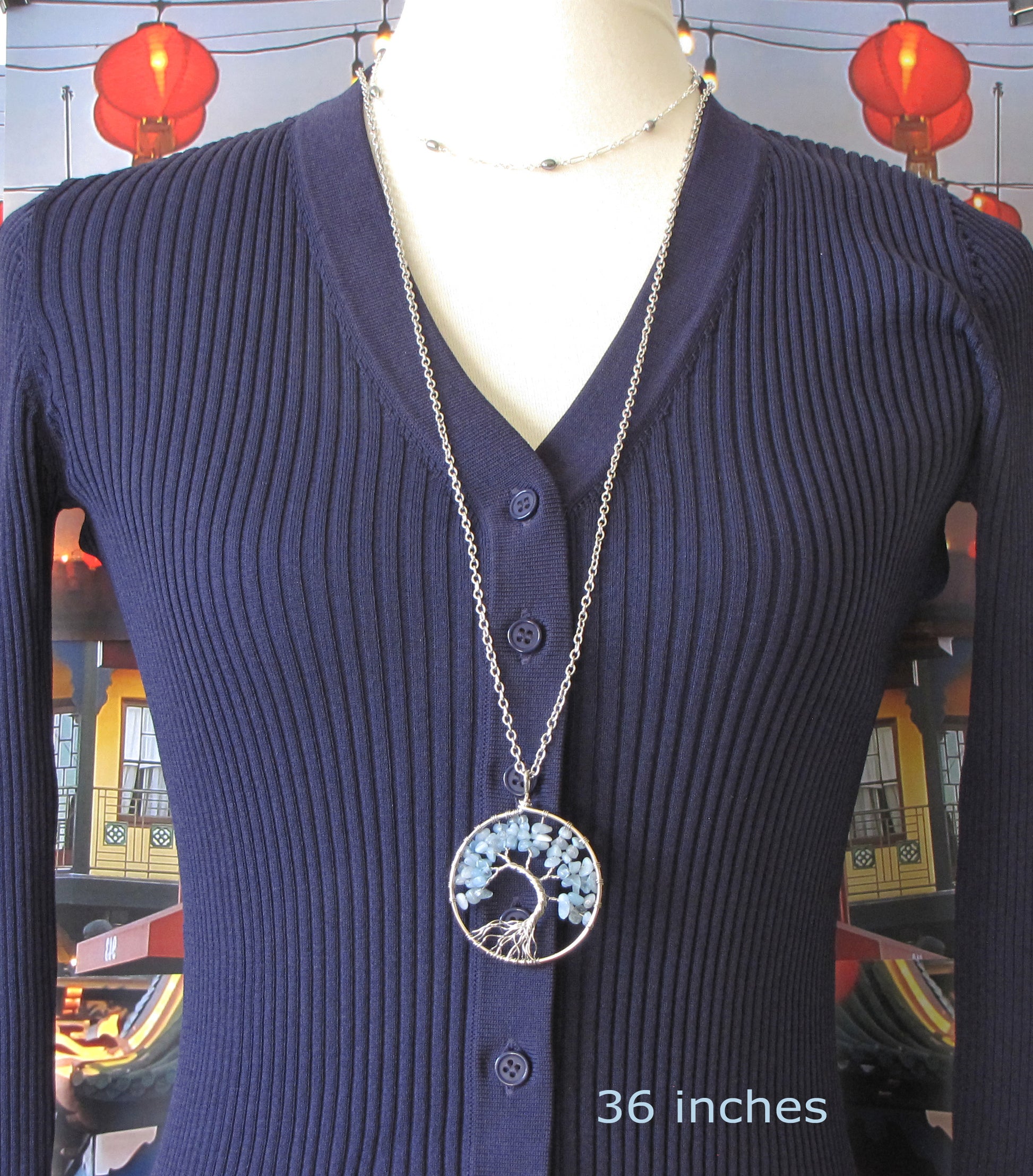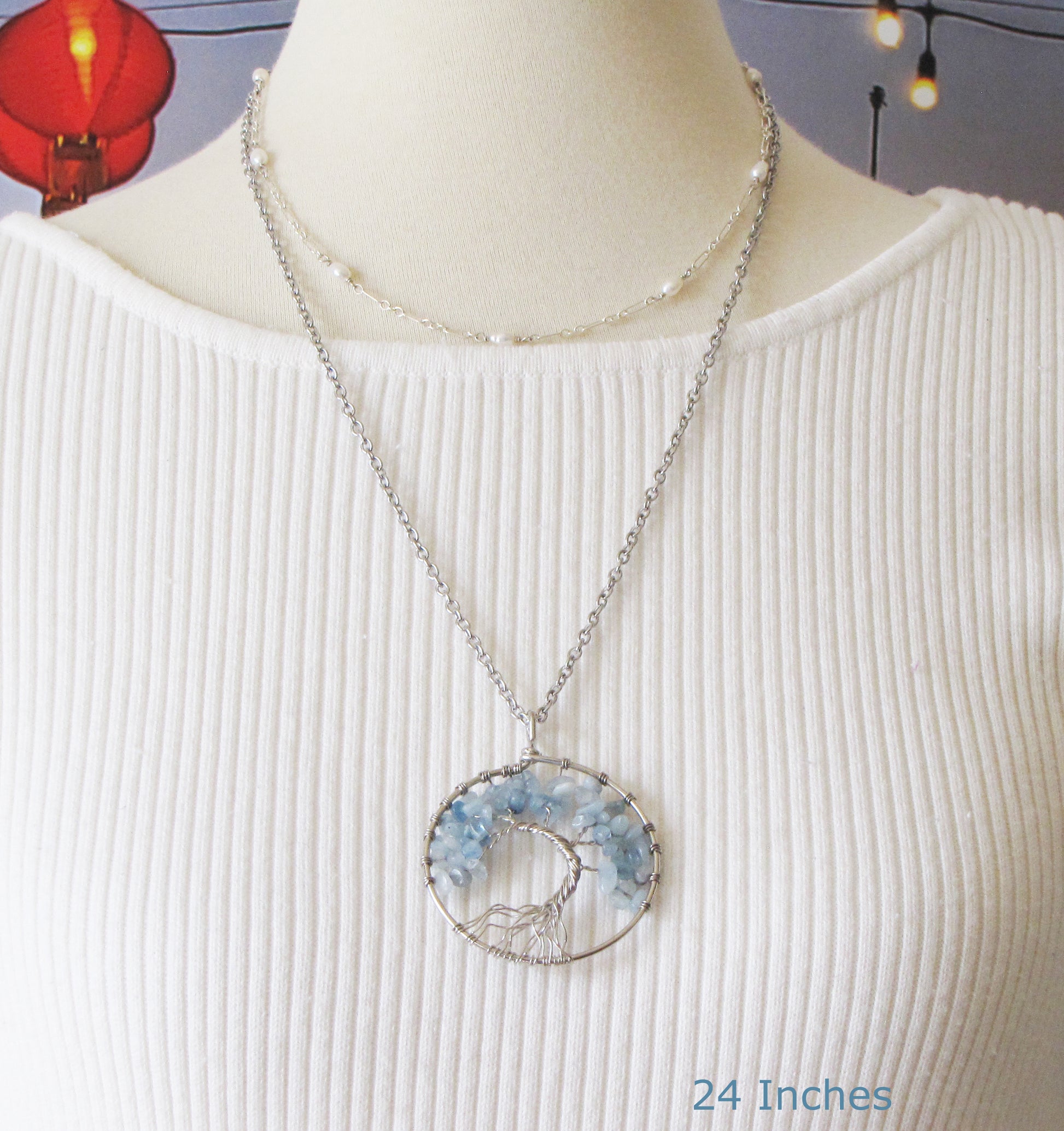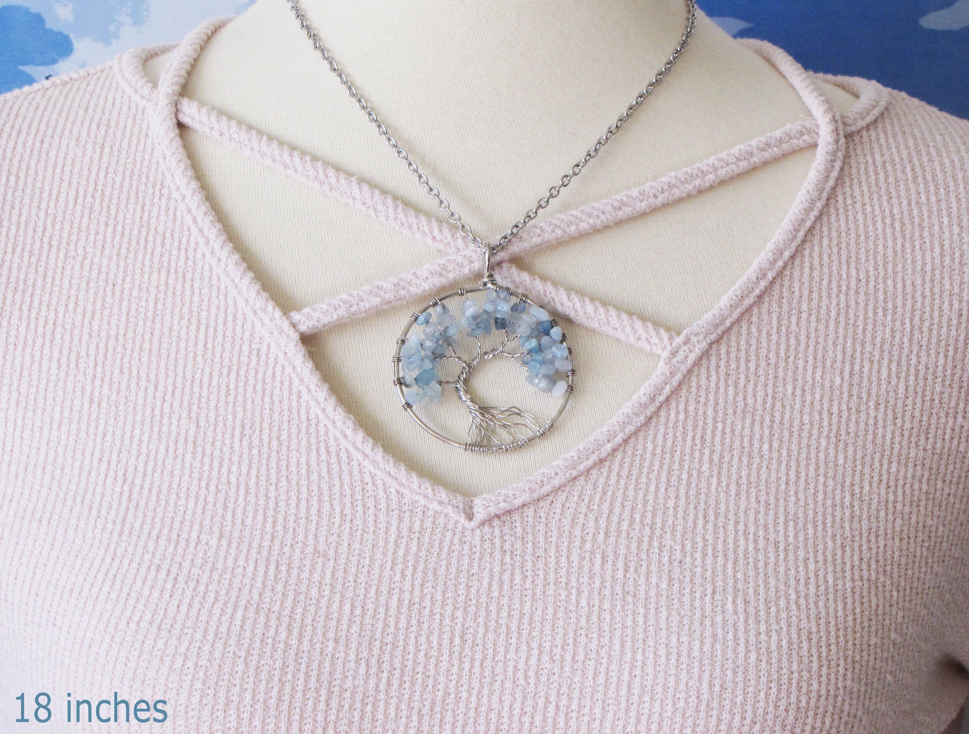 Beauty intertwined with spirituality in the Tree of life pendant necklace, with semi precious Aquamarine stones.