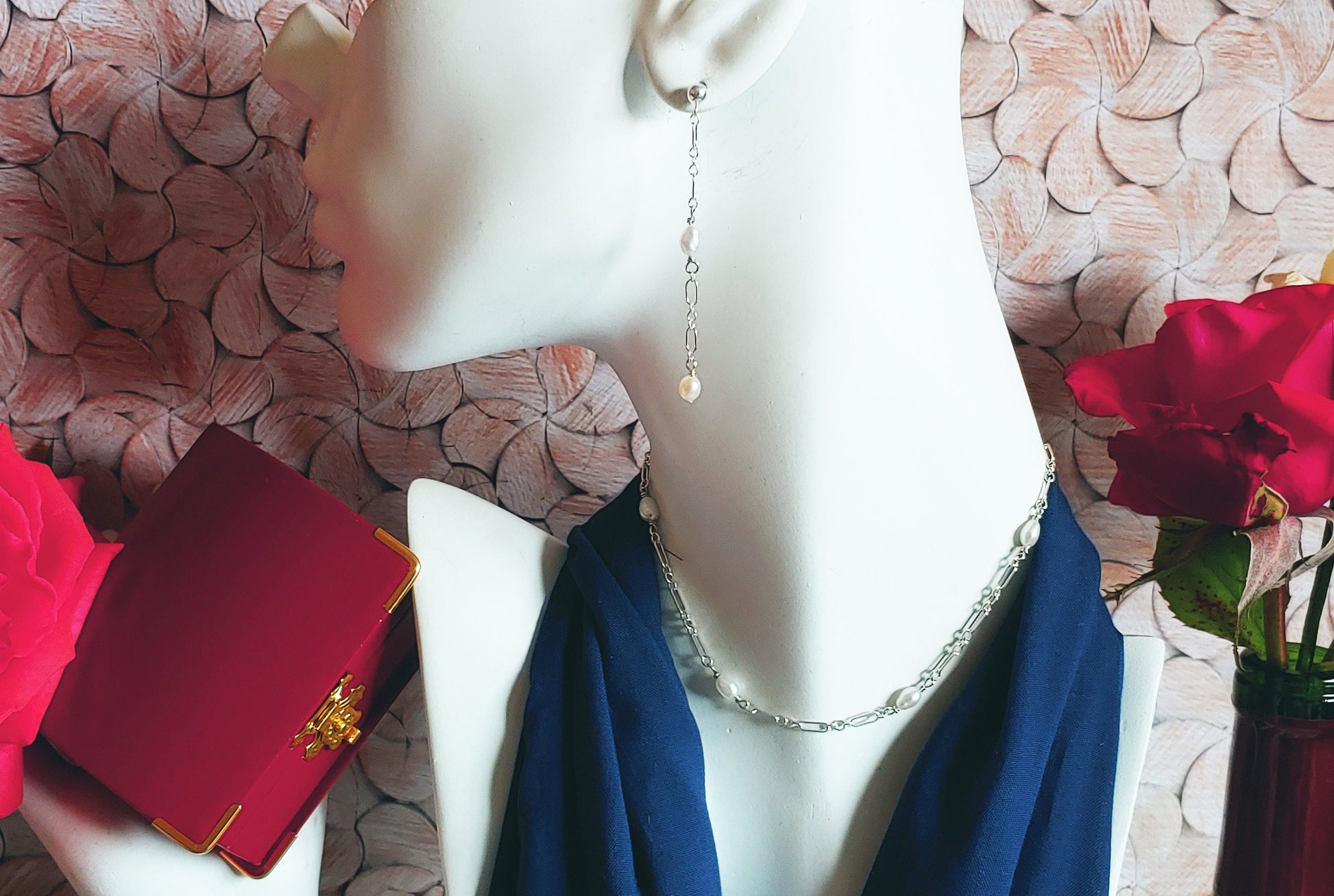 White Freshwater pearl tincup necklace and dangle earrings gift set